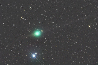 Kiffa Australis ( Alfa Librae ) - o par é visível abaixo do cometa Lulin ( a mancha esverdeada em 1º plano ). |