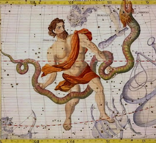 | Na ilustração estão evidenciadas duas constelações: a Serpente e Ofiúco ou Serpentário ( o homem que a segura ). |